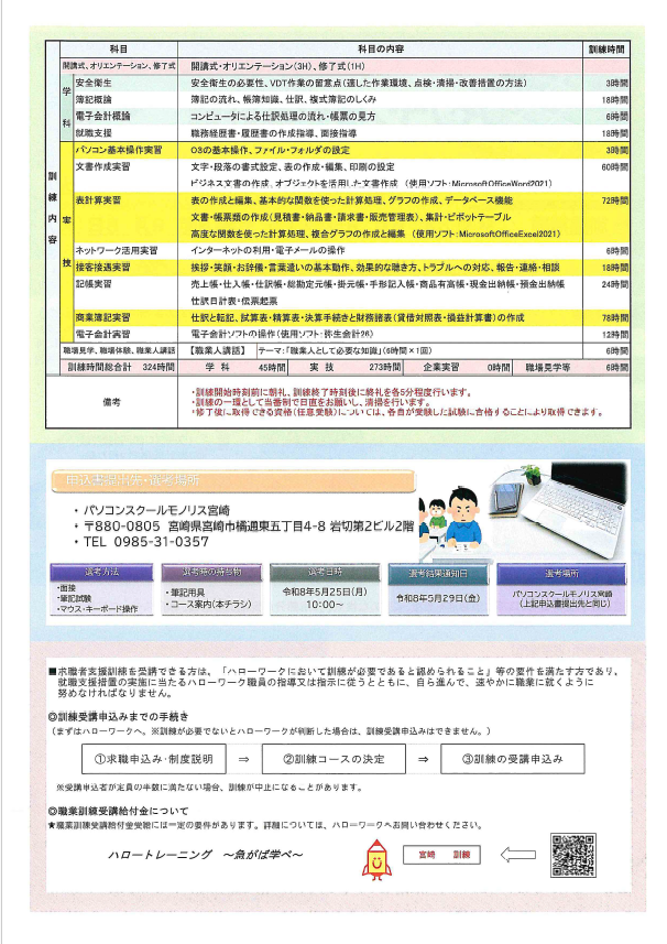 職業訓練とは、無料で求職者の方が新たな就職に必要なパソコンの知識・技能を習得することにより早期就職を促進するための訓練です